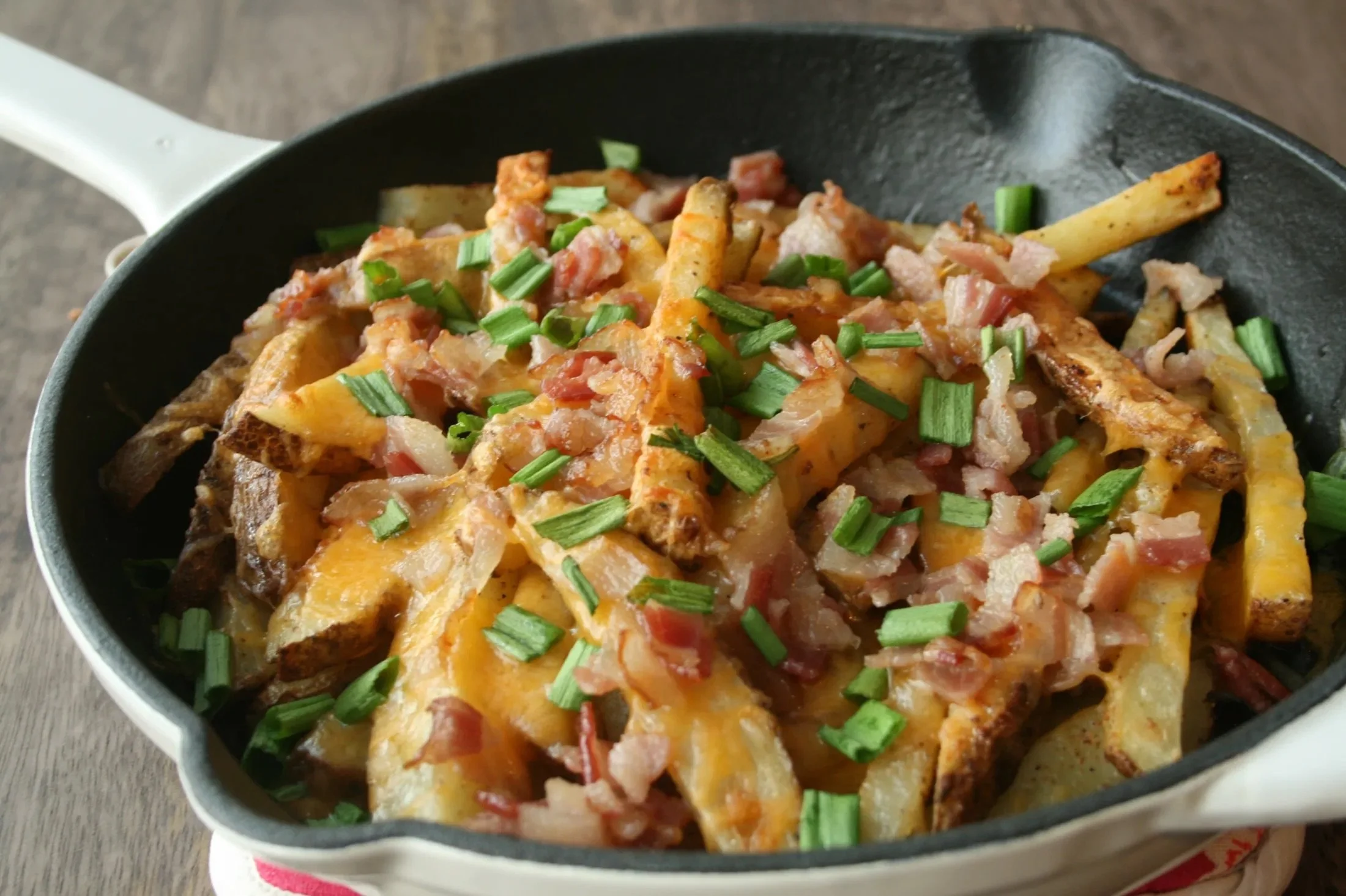 Remove from oven and place in baking pan or cast iron skillet. Top with cheese, bacon, and scallions.