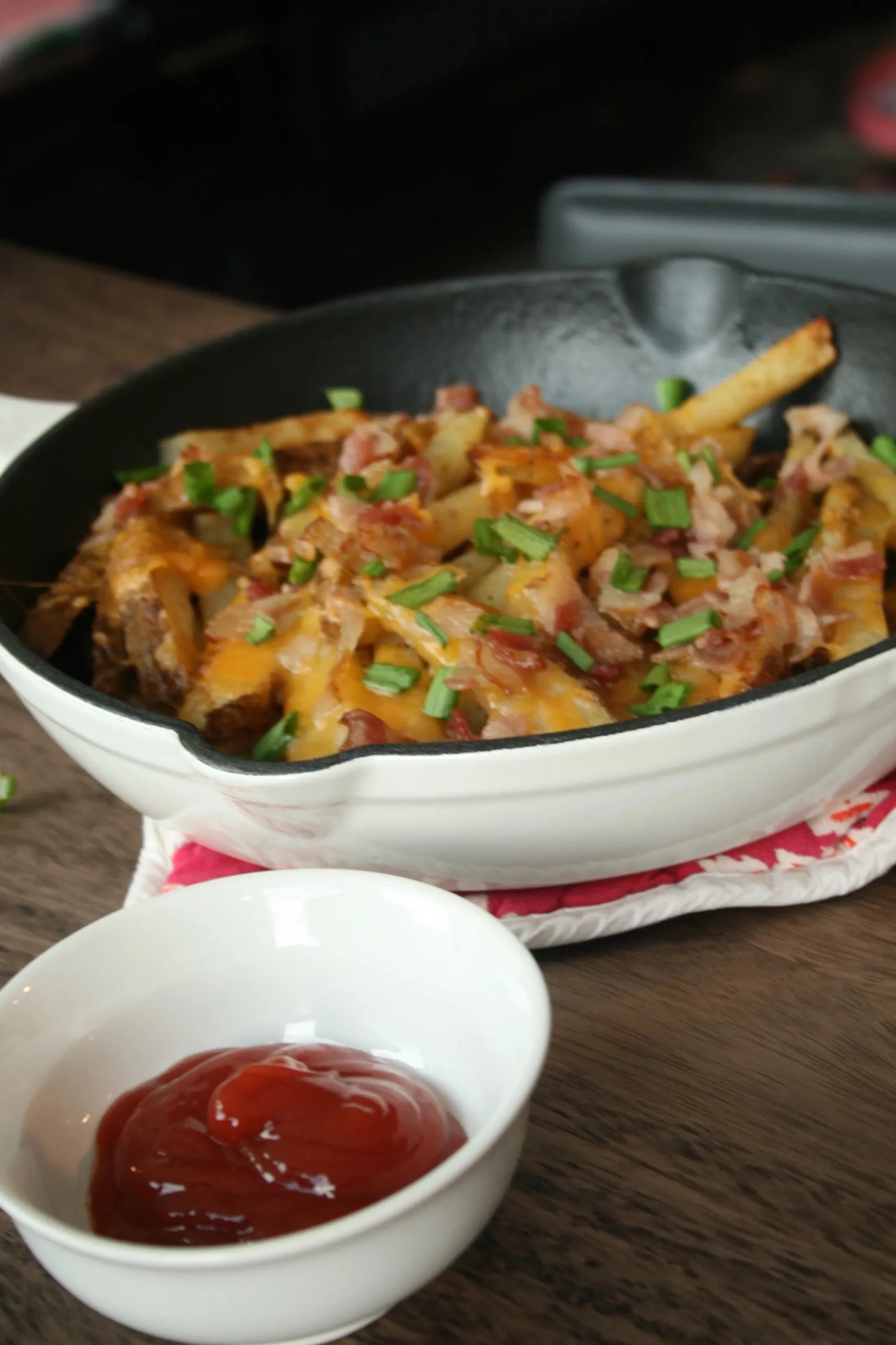 Game days are big in our house (Go Packers!) and i'm always looking for healthy tailgate recipes to serve. These skinny loaded fries are SO good and they cut out so many of the unnecessary calories that restaurants pile on.