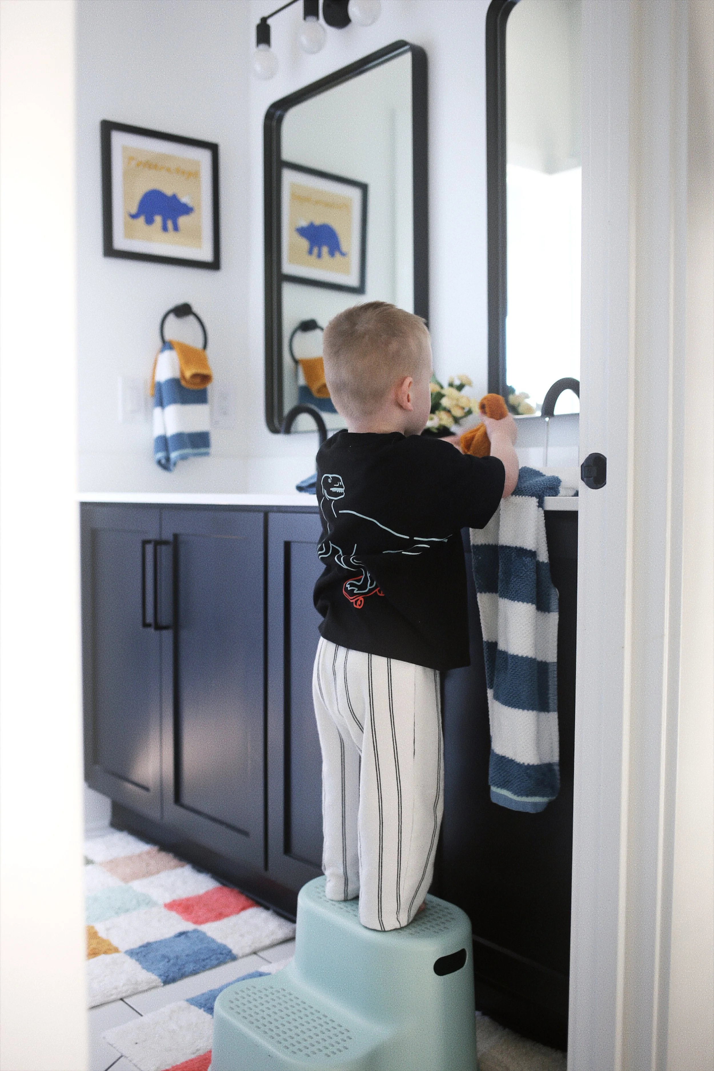When it came time to design a bathroom for our son, Miles, I knew I wanted something that felt playful and colorful—but still cute and cohesive with our home’s style. After all, kids’ spaces don’t have to feel chaotic or over-the-top! Our solution? A dinosaur-themed bathroom that’s full of personality, but still easy on the eyes.