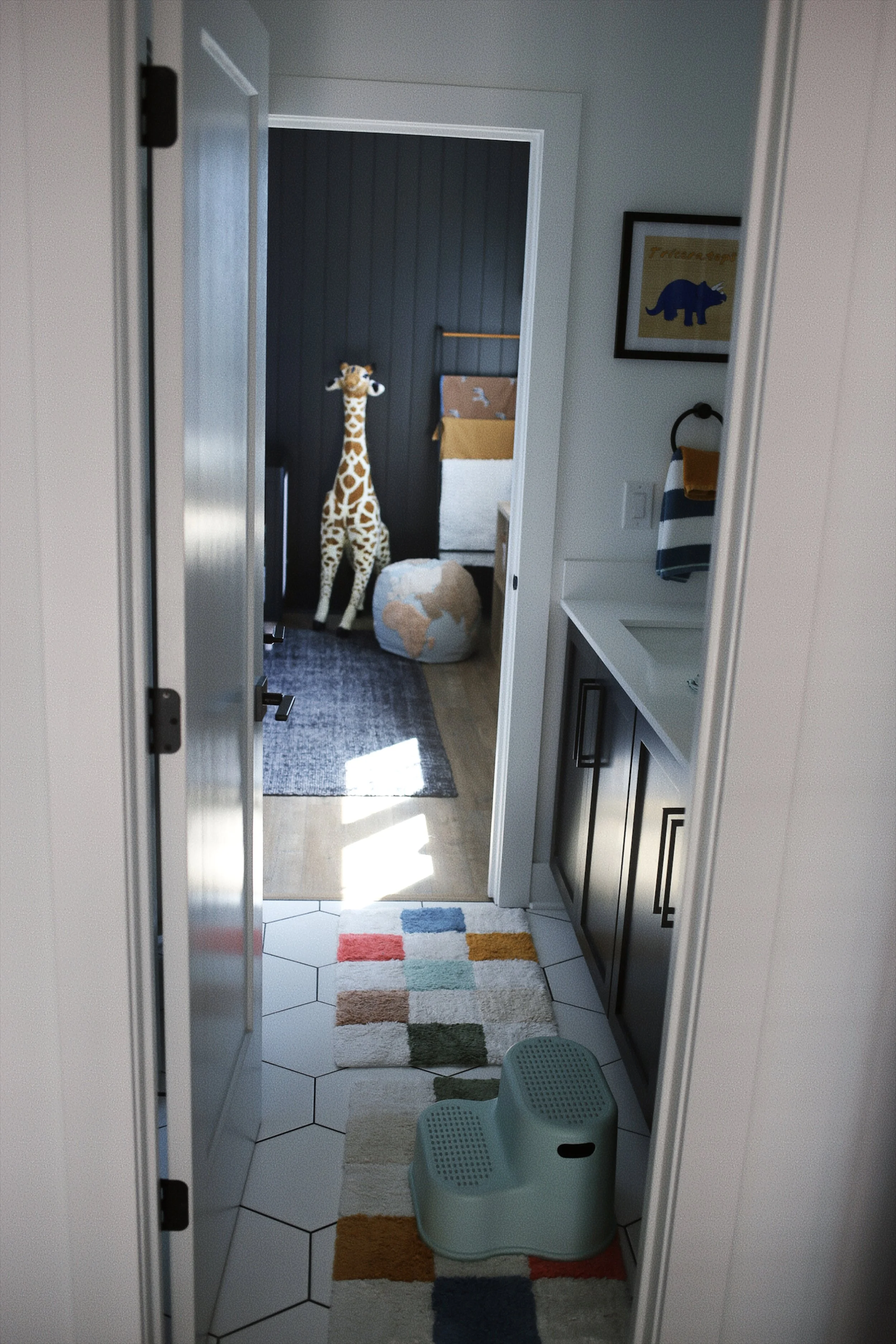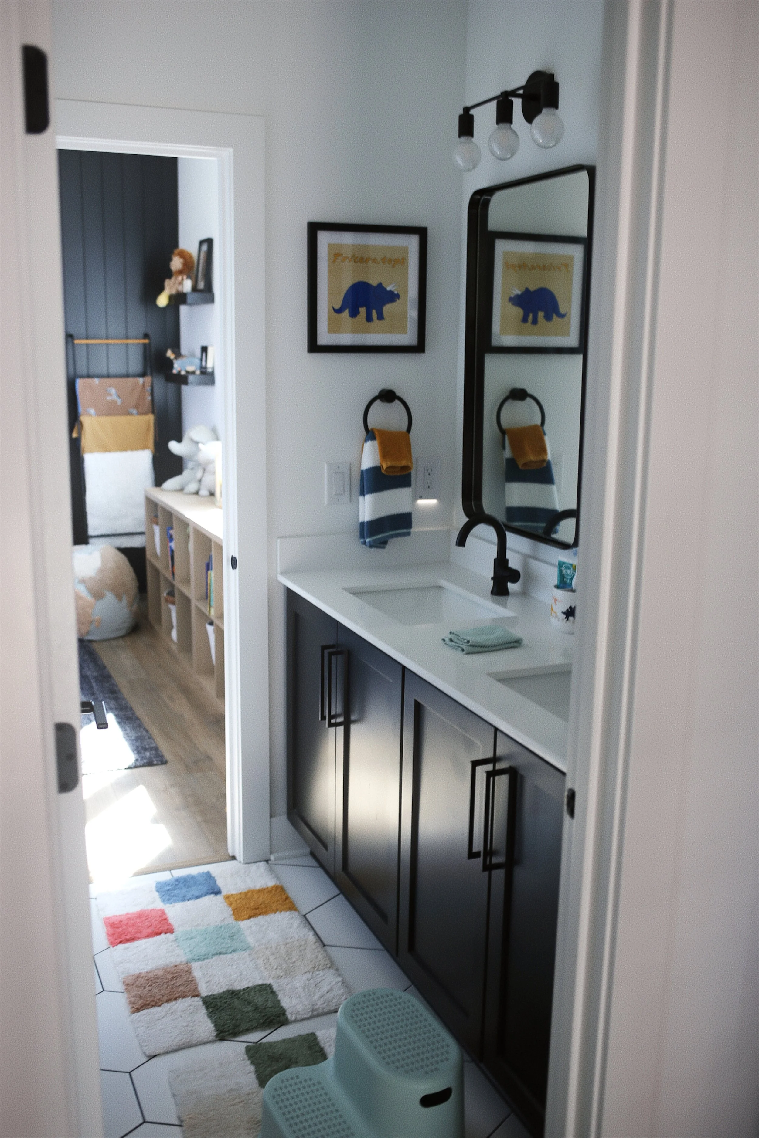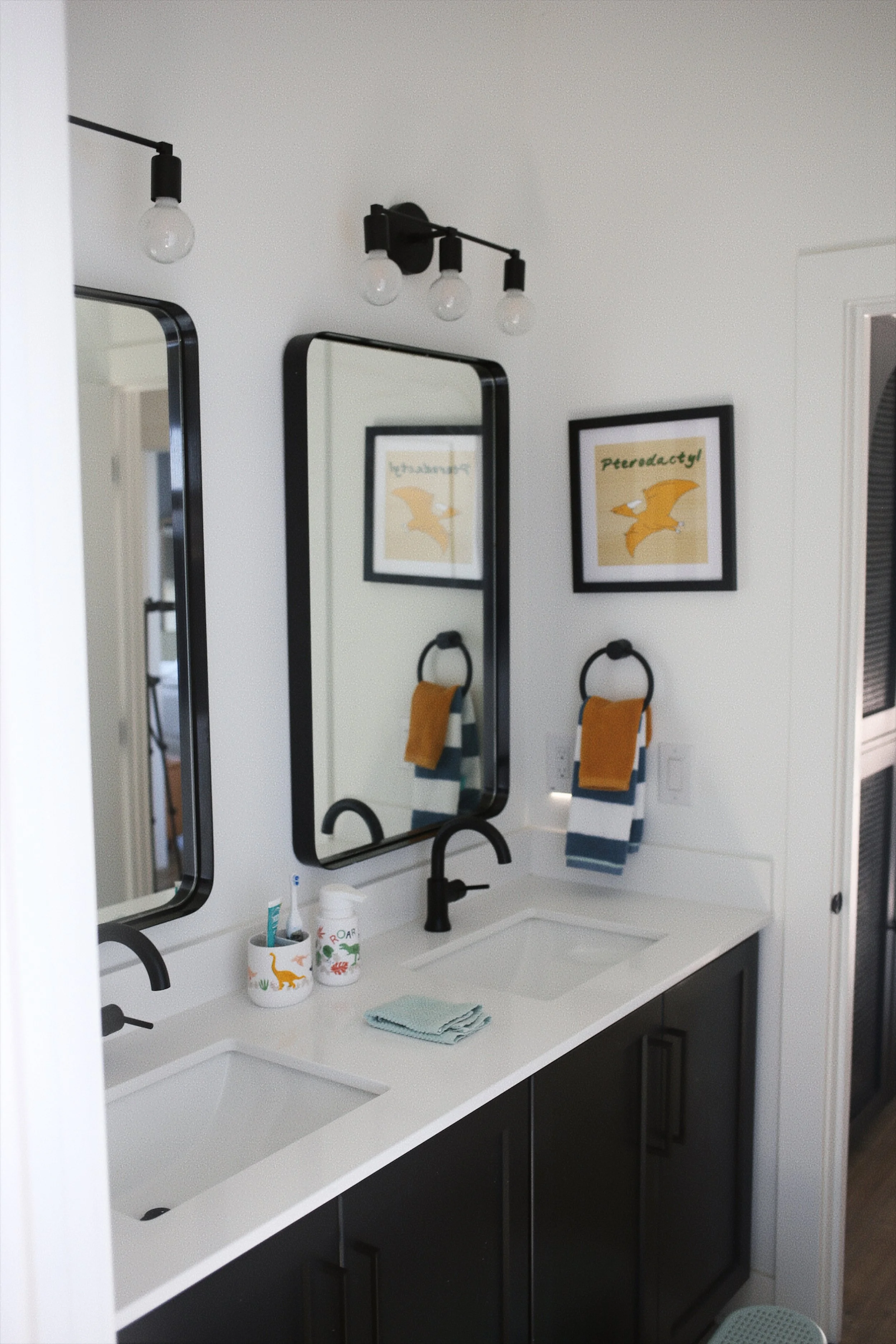 Even in a themed bathroom, balance is everything. We paired the playful dinosaur elements with simple, modern fixtures and clean lines so the room doesn’t feel too busy. It’s a fun space, but it still feels like part of our home.